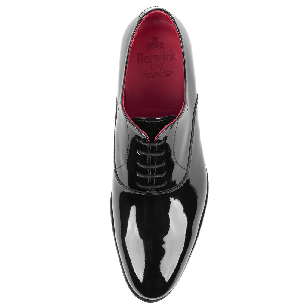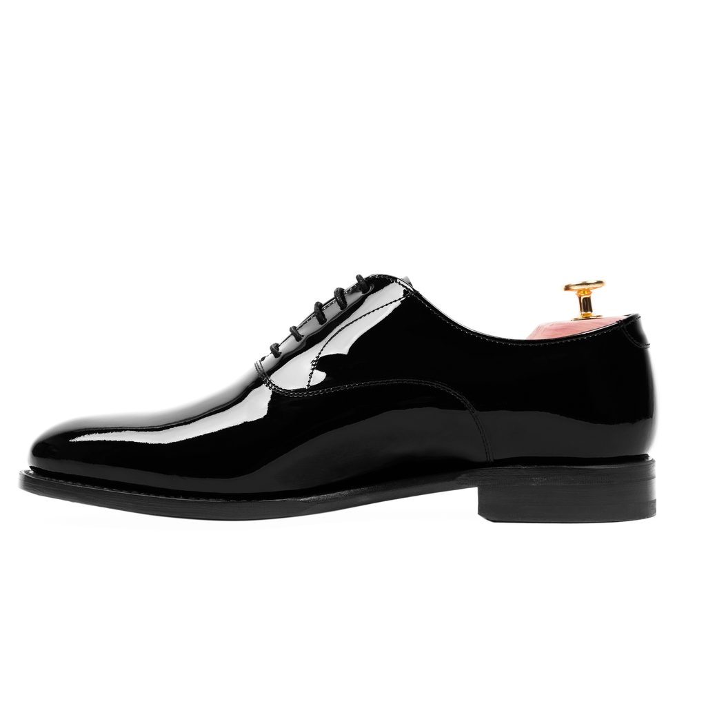 Scarpe oxford nere laccate, dette anche patent. Un classico per le occasioni più formali - con uno smoking e un abito da sera. Queste scarpe sono così lucide che potete controllare nel loro riflesso la vostra pettinatura.