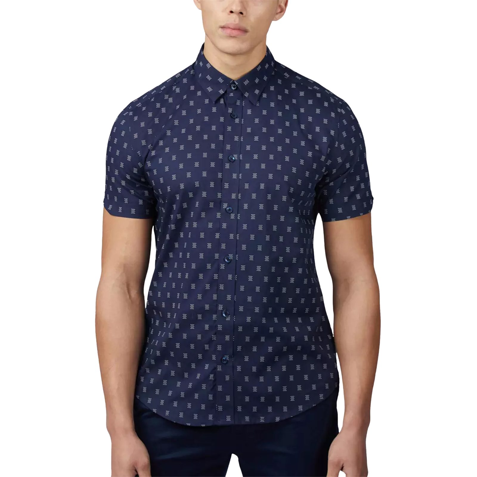 Business casual? In estate solo a maniche corte. Un raffinaato motivo decora la camicia blu scuro del famoso marchio di trame, rendendola un capo versatile, adatto sia alle parco che all'ufficio. Con un design minimalista, presenta un moderno orlo inferiore arrotondato e un colletto classico.