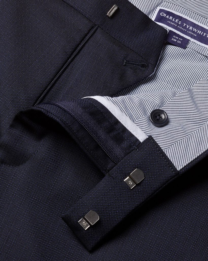Grazie alla struttura del tessuto, che non è eccessivamente marcata, sono adatti a essere indossati tutto l’anno. Sono foderati fino al ginocchio con un tessuto a righe di grande effetto. Il taglio è quello classico: chiusura con patta alla francese, passanti per la cintura, e una vestibilità Slim classica, che secondo lo stile Charles Tyrwhitt si adatta alla maggior parte delle corporature.