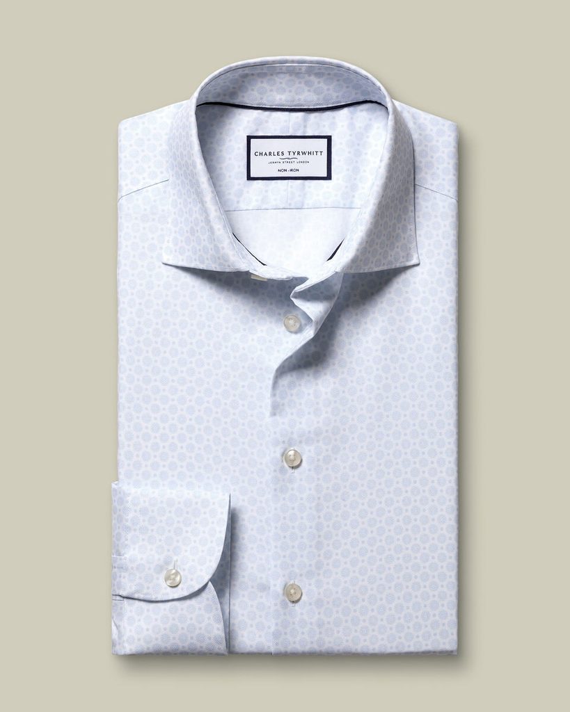 Camicia azzurro chiaro Charles Tyrwhitt con delicato motivo geometrico, che dona al classico design un tocco moderno. Elegante ma informale – ideale per le giornate in cui desiderate un aspetto curato senza la necessità di indossare la cravatta.