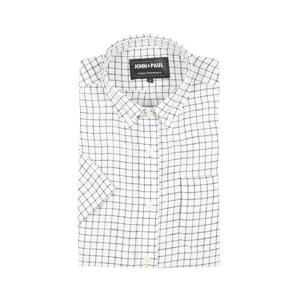 Nell’ambito della collezione estiva di camicie John & Paul questa volta ci siamo spinti oltre. In pratica questo significa il primo lotto di camicie, tra le quali si trovano anche capi a maniche corte - per le grigliate estive, le vacanze e i festival, anche noi puritani consideriamo questo accettabile. Il resto è decisamente decente. Questa camicia ha un colletto morbido con abbottonatura, un taschino sul petto e un colore bianco crema intrecciato da quadretti neri. Il suo taglio è casual, cioè più ampio e corto, il che la rende molto facile da indossare fuori dai pantaloni.