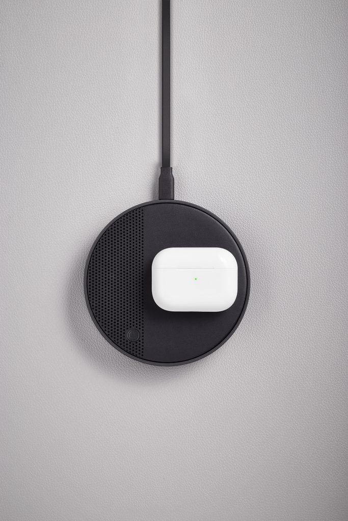 Caricatore wireless multifunzionale che combina un design raffinato con un suono di qualità. Sulla parte destra della superficie si trova una bobina di ricarica da 10 W, in grado di ricaricare qualsiasi telefono o auricolare compatibile. Sul terzo sinistro è presente un altoparlante (con un pulsante di controllo), dotato anche di un microfono di qualità. Dopo aver accoppiato il dispositivo Oslo Energy+ tramite Bluetooth, è possibile utilizzarlo per effettuare chiamate in conferenza.