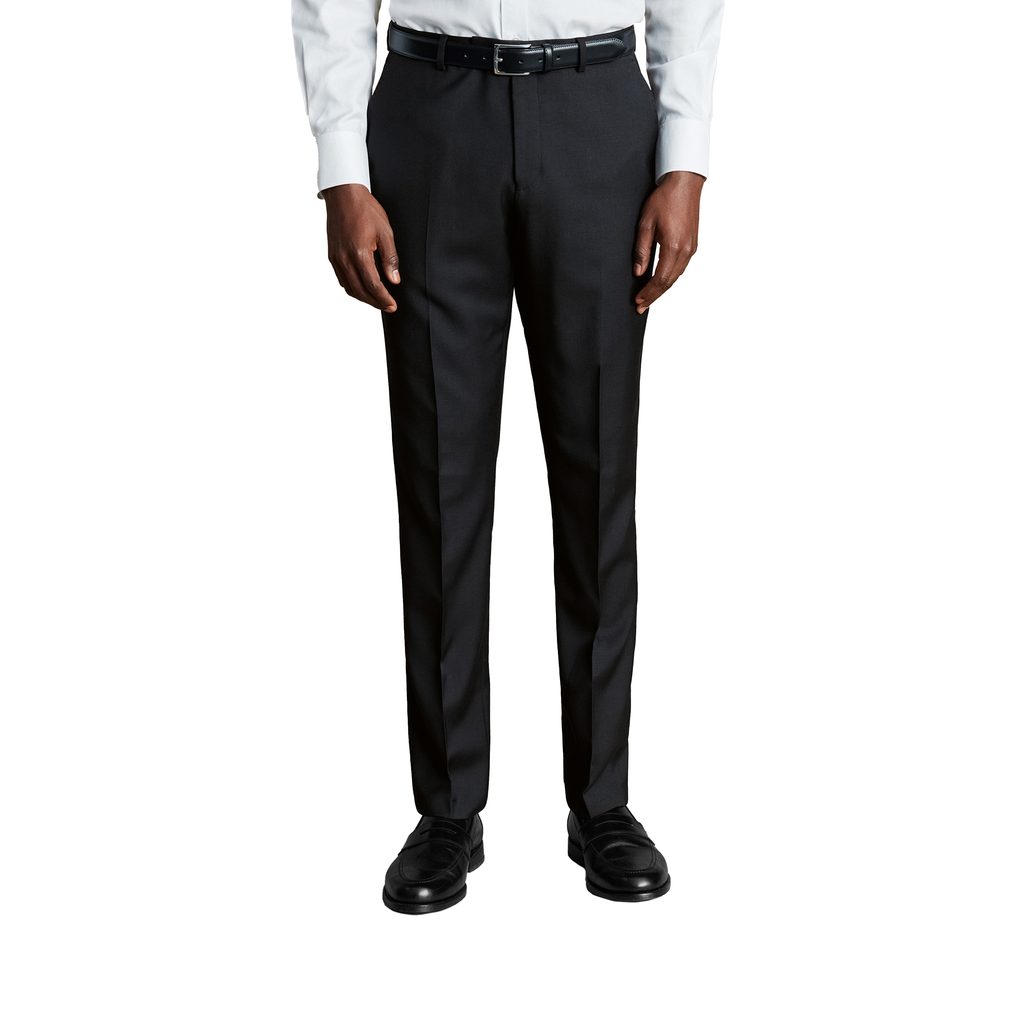 Perfettamente eleganti, completamente in lana. Pantaloni da abito neri realizzati in Super 100 in molte taglie. Un capo minimalista, piatto davanti (non plissettato e senza pinces) e foderato fino al ginocchio con una disposizione leggermente più leggera. Comprensibilmente, vantano anche di una elegante chiusura nascosta (ovvero in sovrapposizione).